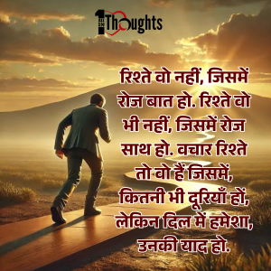 रिश्ते वो नहीं, जिसमें रोज बात हो. रिश्ते वो भी नहीं, जिसमें रोज साथ हो. वचार रिश्ते तो वो हैं जिसमें, कितनी भी दूरियाँ हों, लेकिन दिल में हमेशा, उनकी याद हो.